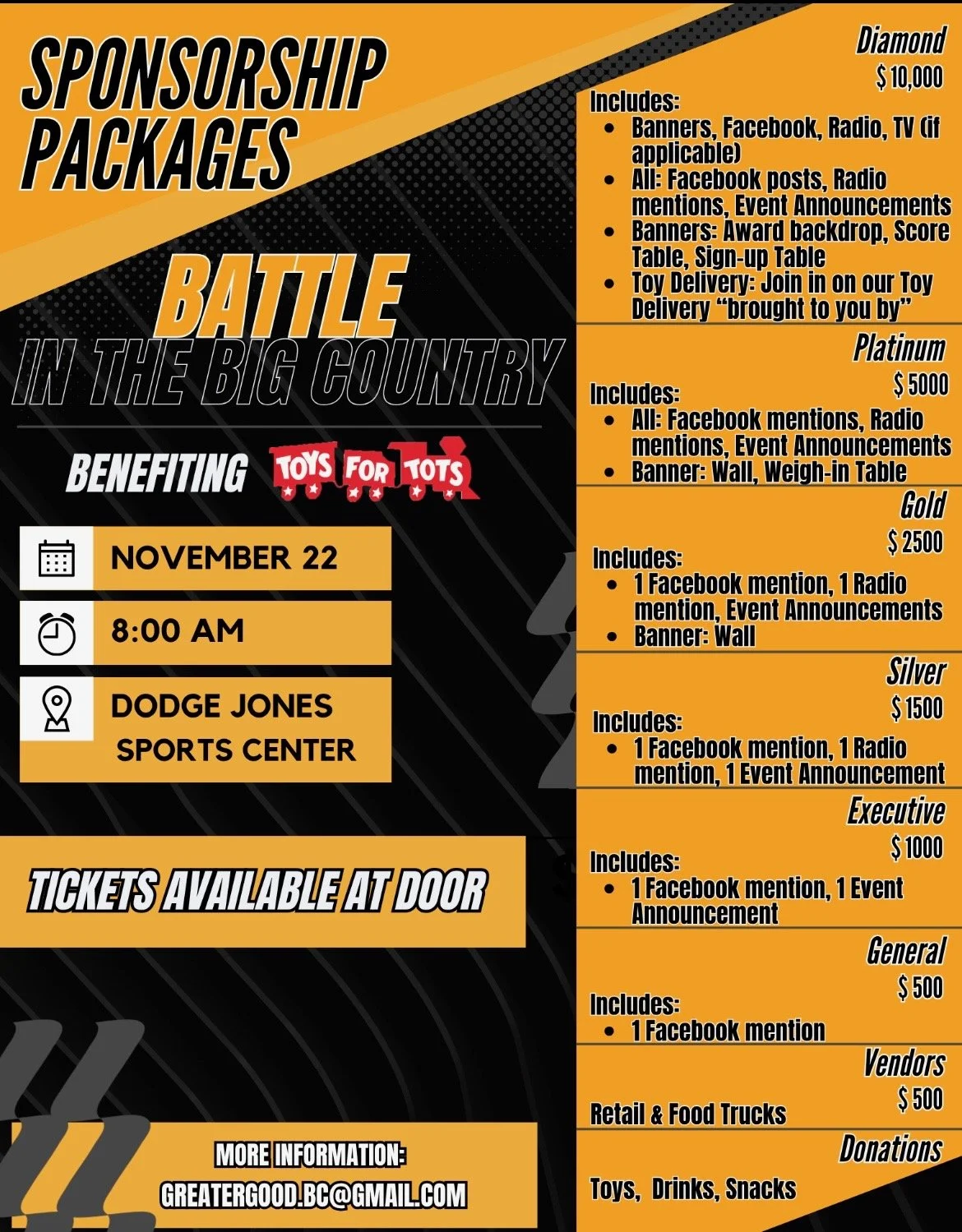 Battle in the Big Country offers unique opportunities for businesses and vendors to support our community while gaining valuable exposure. Sponsorship packages range from $500 to $10,000 and include benefits like banner placement, social media promotion, and radio mentions. Vendor booths provide direct access to hundreds of competitors and spectators throughout the competition day. Every dollar and every partnership helps bring joy to local children through Toys for Tots. Join us in making a difference while building your brand.